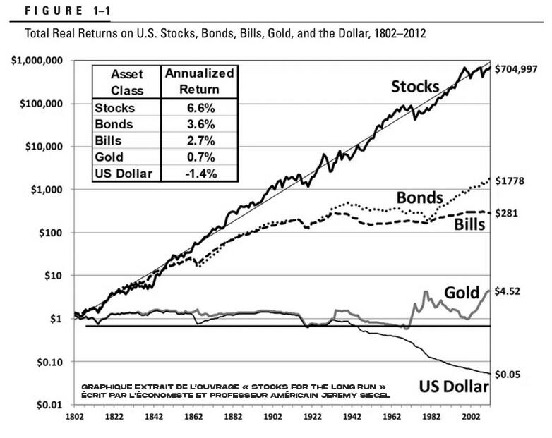 Ce rendement annualisé est celui calculé sur le marché action aux U.S.A sur longue période, entre 1802 et 2012. Malgré les crises et les guerres, cette classe d'actifs surperforme de loin les autres sur cette période.